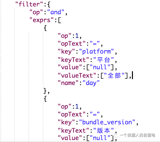 filter:这部分是用来设置过滤器,前端报表用来筛选查询条件的,它要规定每个维度应该以何种规则来过滤,是等于、不等于、大于、小于还是包含,还要规定维度的查询字段和查询值,简单表示下就是下面这种格式,当然还有很多字段可以添加以便进一步扩展功能,具体filter的格式可以参考下图。