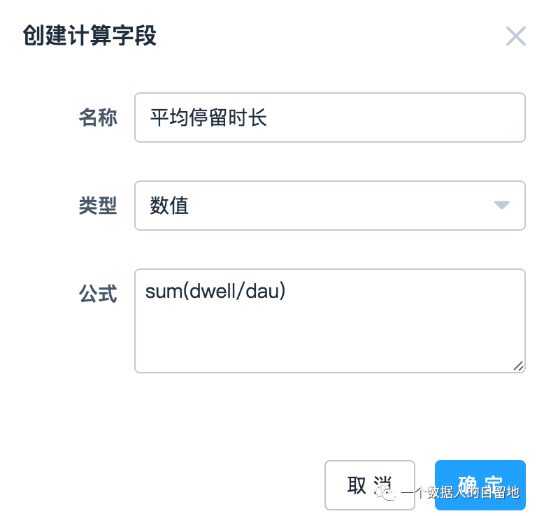 自助分析功能这部分主要包含创建单图(chart)和创建看板(dashboard)两部分,这两部分都是基于前期灵活可扩展的json图表配置,并在此基础上,能够创建一些复杂的计算字段,例如,想计算平均停留时长这个指标,它是由总停留时长除以dau计算而成的,总停留时长和dau都是基础指标,在数据表中是已经存在的,那么就可以定一个计算字段,命名为平均停留时长,计算公式为sum(dwell/dau),如下图3所示: