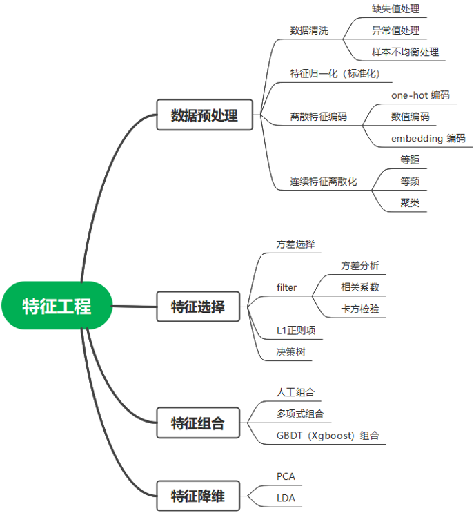 作者介绍 1 前言:什么是特征工程 数据和特征决定了机器学习的上限,而模型和算法只是逼近这个上限而已。特征工程指的是把原始数据转变为模型的训练数据的过程,它的目的就是获取更好的训练数据特征,使得机器学习模型逼近这个上限。 构建一个算法模型需要几个步骤,包括数据准备、特征工程、模型构建、模型调优等,其中特征工程是最重要的步骤,需要 70% 甚至以上的工作量。特征工程主要包括数据预处理、特征选择、特征构造、特征降维等。 通过总结和归纳的特征工程包括以下方面: 2 数据预处理 数据预处理是特征工程的最重要的起始步骤,主要包括数据清洗、特征归一化、特征编码、特征离散化等。 2.1 数据清洗 数据清洗是数据预处理阶段的主要组成部分,主要包括缺失值处理、异常值处理、样本不平衡处理等。 2.1.1 缺失值处理 一般来说,未经处理的原始数据中通常会存在缺失值,因此在建模训练之前需要处理好缺失值。 1)缺失数据占比小于 20%。可以通过直接填充法,连续特征一般取均值填充,离散特征可以取众数填充;可以模型预测法,通过随机森林或者决策树进行预测结果填充;也可以通过插值法填充。 2)缺失数据占比大于 20% 小于 50%,这个时候可以把缺失值构建为新的特征,增加一列离散特征,即有缺失数据和无缺失数据。 3)缺失数据占比大于 50%,因为信息量较少,模型可能会学到大量噪音建议直接删除该特征。 像 xgboost 模型自带缺失值处理功能,可以不进行缺失值处理。 2.1.2 异常值处理 异常值,即在数据集中存在不合理的值,又称离群点、极值等。可以通过统计分析、箱线图、聚类、3σ 原则、孤立森林等方法进行检查。一般的处理方法如下: 1)直接删除含有异常值的样本。 2)视为缺失值。利用缺失值处理的方法进行处理。 3)最近值修正。可以用相近的观测值修正该异常值。 4)不处理。可以直接在具有异常值的数据集上进行数据建模。 2.1.3 样本不均衡处理 样本不均衡现象是指正样本数目与负样本数目比列相差很大。处理方法如下: 1)下采样/欠采样(under sampling):从多数类中随机抽取样本从而减少多数类别样本数据,使数据达到平衡的方式。比如本来样本正负例的比例是 10:1,可以对正样本进行下采样构建 10 个正负样本比例为 1:1 的模型,回归结果取平均值,分类结果进行投票。 2)上采样/过采样(Over Sampling):和欠采样采用同样的原理,通过抽样来增加少数样本的数目,从而达到数据平衡的目的。同样比如本来样本正负例的比例是 10:1,可以对负样本进行上采样构建正负样本比例为 1:1 的模型。 3)Smote 算法:Smote 算法属于上采样的一种,通过人工合成的方法来生成少类别的样本。方法也很简单,对于某一个缺少样本的类别,它会随机找出几个该类别的样本,再找出最靠近这些样本的若干个该类别样本,组成一个候选合成集合,然后在这个集合中不停的选择距离较近的两个样本,在这两个样本之间,比如中点,构造一个新的该类别样本。举个例子,比如该类别的候选合成集合有两个样本(x1,y),(x2,y)(x1,y),(x2,y),那么 Smote 采样后,可以得到一个新的训练样本(x1+x22,y)(x1+x22,y),通过这种方法,我们可以得到不改变训练集分布的新样本,让训练集中各个类别的样本数趋于平衡。 4)Focal loss :主要解决分类样本不平衡问题,通过修改交叉熵损失函数,通过增加类别权重 α 和样本难度权重调因子(modulating factor)(1−pt)γ(1−pt)γ,来减缓上述问题。 5)设置损失函数的权重:使得少数类别数据判断错误的损失大于多数类别数据判断错误的损失,即当我们的少数类别数据预测错误的时候,会产生一个比较大的损失值,从而导致模型参数往让少数类别数据预测准确的方向偏。 2.2 特征归一化(标准化) 归一化(标准化),就是要把你需要处理的数据经过处理后(通过某种算法)限制在你需要的一定范围内。其目的一是把不同量纲的东西放在同一量纲下,保正程序运行时收敛加快,大部分模型归一化后收敛速度会加快。但像树模型不受特征归一化影响,所以不需要特征归一化。 1)归一化处理:最大最小值归一化或者叫 0-1 归一化,取值范围在 [0,1] 处理,max 为样本最大值, min 为样本最小值。 2)标准化处理:这里只介绍一种经常使用的 z-score 标准化,经过处理后的数据均值为 0,标准差为 1,符合标准的正态分布。其中 mean 为平均值,б 为标准差。 2.3 离散特征编码 离散特征无法直接使用,需要编码后才能进行相关计算分析。离散特征编码主要有三种方式,独热编码、数值编码、embedding 编码等。 1)独热(one-hot)编码 将离散型特征的每一种取值都看成一种状态,若你的这一特征中有 N 个不相同的取值,那么我们就可以将该特征抽象成 N 种不同的状态,one-hot 编码保证了每一个取值只会使得一种状态处于 “激活态”,也就是说这 N 种状态中只有一个状态位值为 1,其他状态位都是 0。主要用于数值之间没有大小数值比较,例如将三种不同颜色 red、blue、yellow 编码,映射到( 1 , 0 , 0 ) 、 ( 0 , 1 , 0 )、( 0 , 0 , 1 ) 的向量空间中,映射后类别之间的距离相等,各个类别在运算时权重相等。 2)数值编码 直接将类别 A,B,C … 映射到 1,2,3…,适用于存在大小内在关系的类别特征。例如等级 A>B>C。 3)embedding 编码 embedding 编码适用于类别量太多,如果进行 one-hot 编码太过于稀疏,不利于模型训练,一般通过 embedding 编码进行