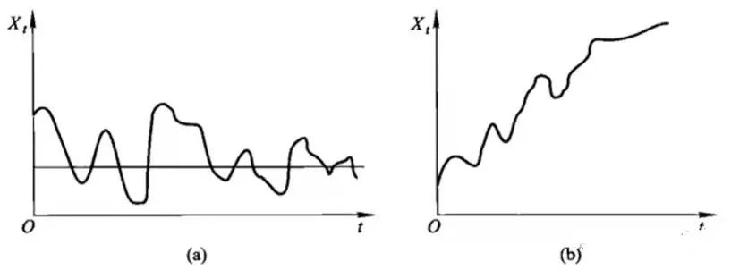 定这些假设前提的目的是便于后续技术上的处理。根据时序图粗略来判断序列是否平稳,平稳时序图的特征为围绕均值不断波动,而非平稳时序图表现为在不同时间段具有不同的均值。图a为平稳时序图,图b为非平稳时序图。