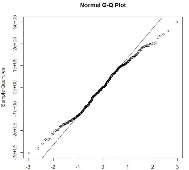 方法一:通过绘制正态分布的QQ来检验:图像近似为过原点的一条直线,则残差服从正态分布且均值为零。该步骤可通过R语言的“qqnormt”函数实现。如下图: