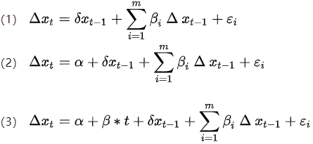 因DF检验假设ut为白噪声,序列为一阶自回归的模型,但实际上随机干扰项并非为白噪声序列,且序列并非为一阶自回归生成,因此用普通最小二乘法进行估计的t统计量会受到无关参数的影响,导致DF检验无效。如果时间序列包含有明显的随时间变化的某种趋势,DF检验必须保证能够剔除这种趋势,否则时间趋势的成分会进入ut,导致ut非白噪声序列,进而偏离了最初的假设。因此形成了ADF检验。ADF检验是由下面3个模型完成: