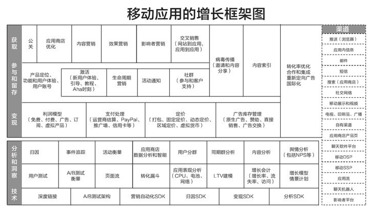 从产品组成和应用场景上来看,华为用户增长运营解决方案,跟《硅谷增长黑客实战笔记》中提到的移动应用的增长框架图结构类似。如下图所示: